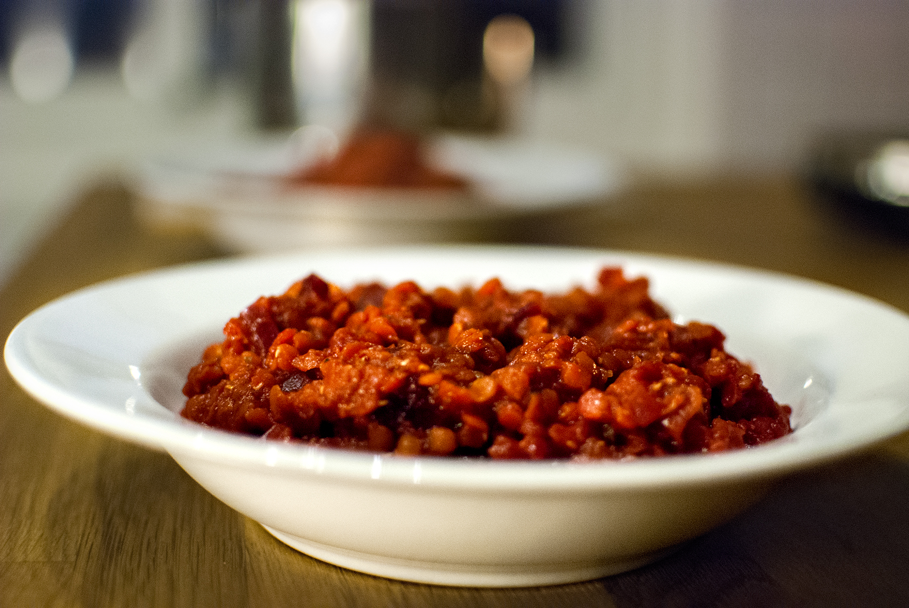 Skölj linserna i kallt vatten och låt rinna av i sil. Hacka rödbetorna och löken i små kuber. Fräs grönsakerna snabbt i smör och olivolja i en tjockbottnad kastrull. Tillsätt de krossade tomaterna, grönsaksbuljong och ett par deciliter vatten. Tillsätt sambal oelek om du vill ha lite sting, salt, peppar, örtkryddor och honung. Låt puttra.