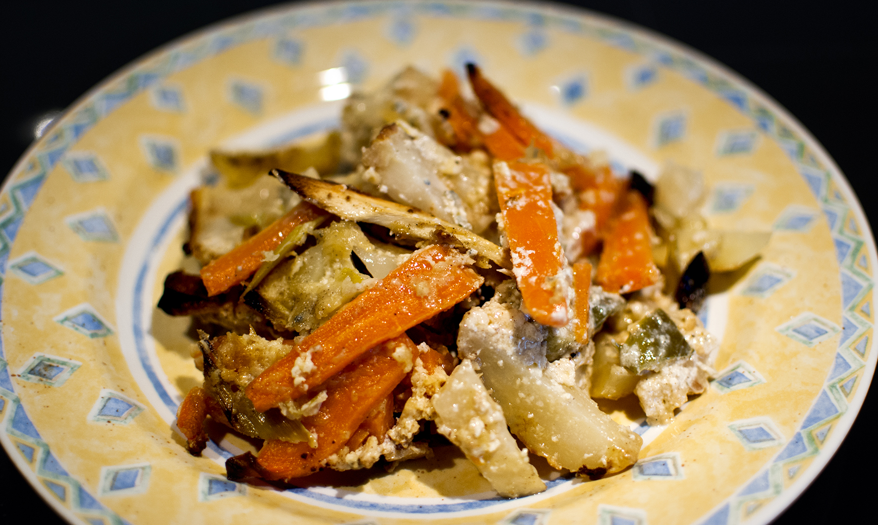 Skär alla rotfrukter i cirka fem centimeter stora bitar. Strimla purjon och skär vitlöken i mindre bitar. Riv ostarna.
