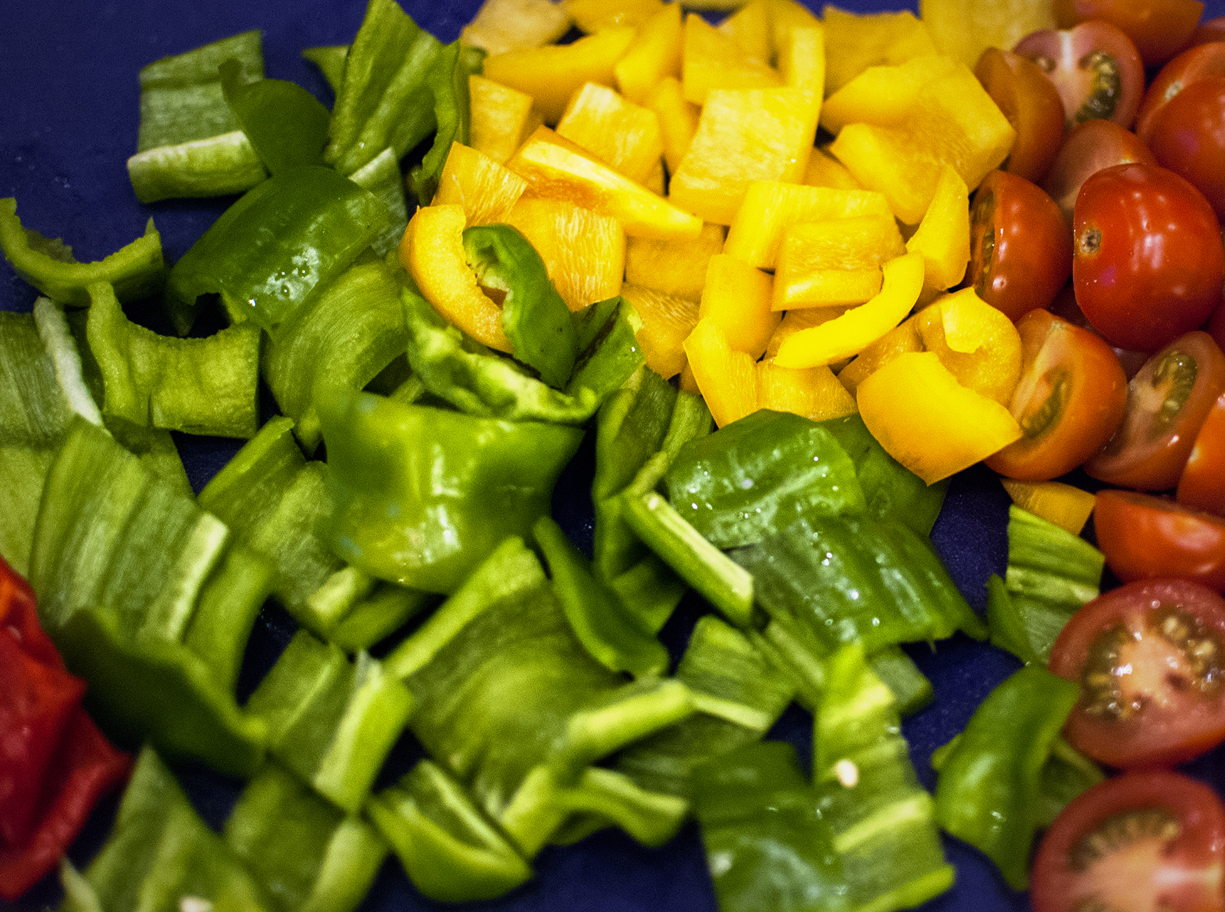 Dela, kärna ur och skär paprikorna i grova bitar. Dela och skär tomaterna i grova bitar.