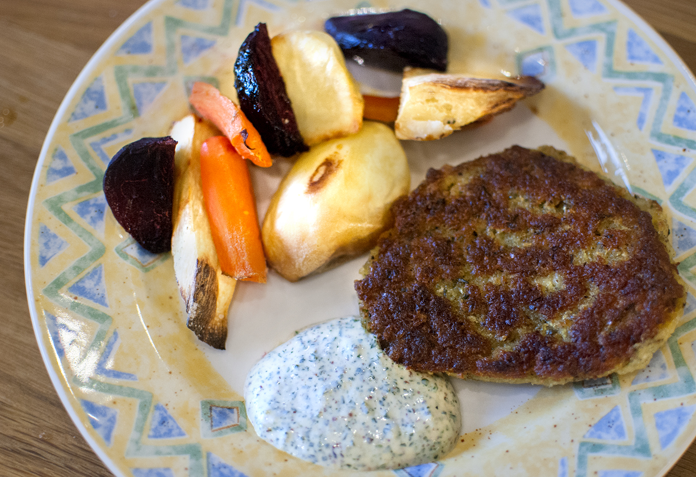 Senapsklick: Rör ihop crème fraiche och senap. Krydda med salt och peppar.Servera biffarna med rotsakerna och senapsklick. Njut!
