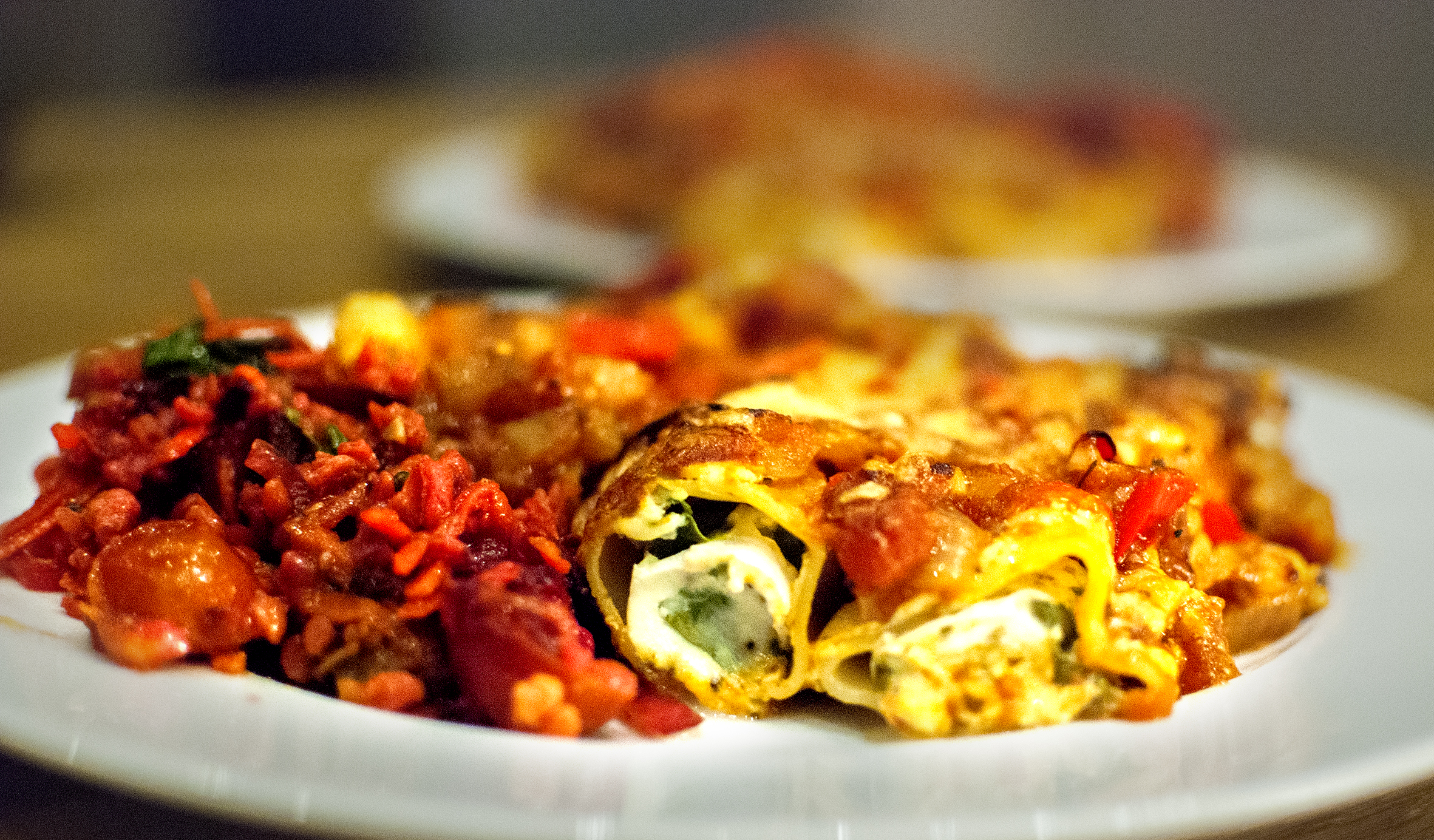 En het pastarätt passar fint i vinterkylan. Jag har jobbat om grundreceptet, som är från Icas tidning Buffé, lite grann. Till exempel byter jag ut de färska lasagneplattorna mot vanlig torr cannelonipasta som jag fyller. Jag lyckas inte rulla lasagneplattorna utan att de spricker.