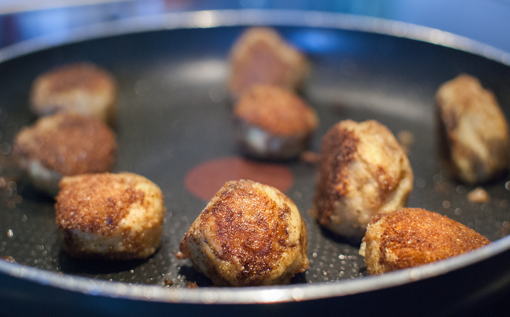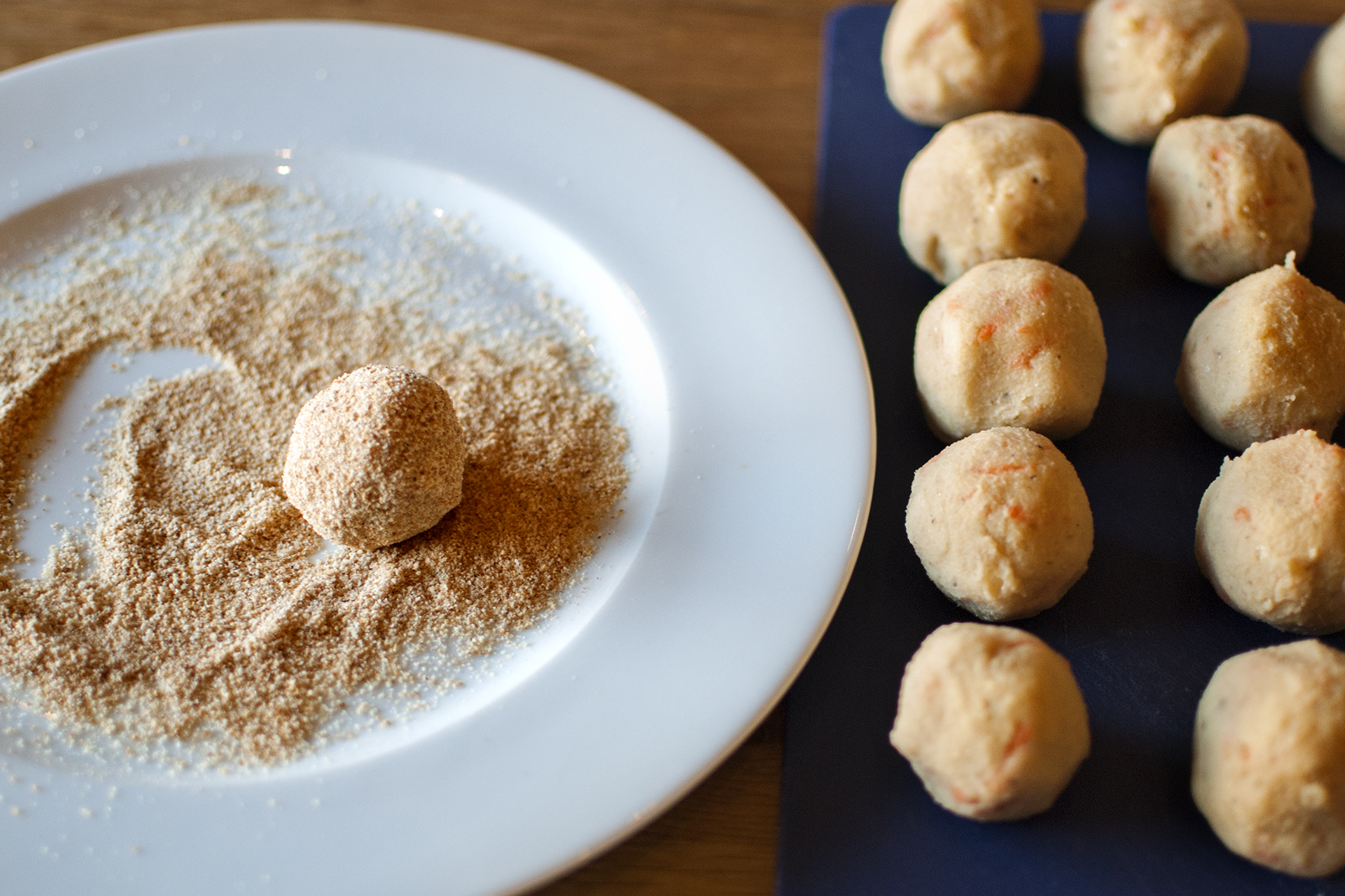 Rulla smeten till runda bullar. Panera dem i ströbrödet och stek dem gyllenbruna runtom i oljan i en stekpanna cirka 10 minuter.