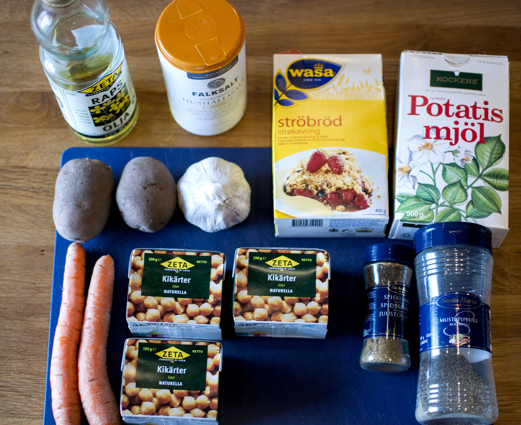 Mosa potatisen och blanda den med kikärtspuré, lök, vitlök, morot, kryddor och potatismjöl.