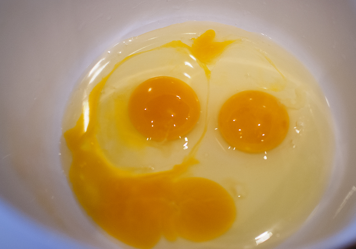Riv osten. Vispa ihop ägg, mjölk, salt och peppar.