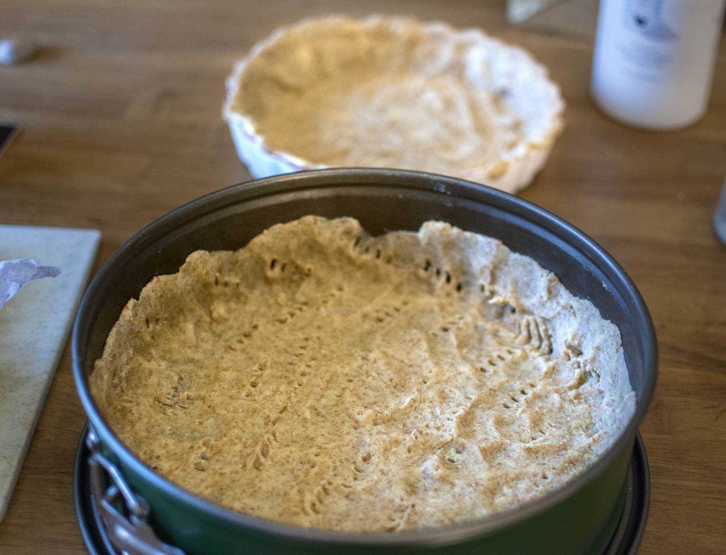 Blanda smör med vete- och grahamsmjöl i en bunke. Tillsätt vattnet och hacka snabbt ihop till en deg. Tryck ut degen i en stor och en mindre pajform. Låt vila i kylskåpet i cirka 30 minuter.