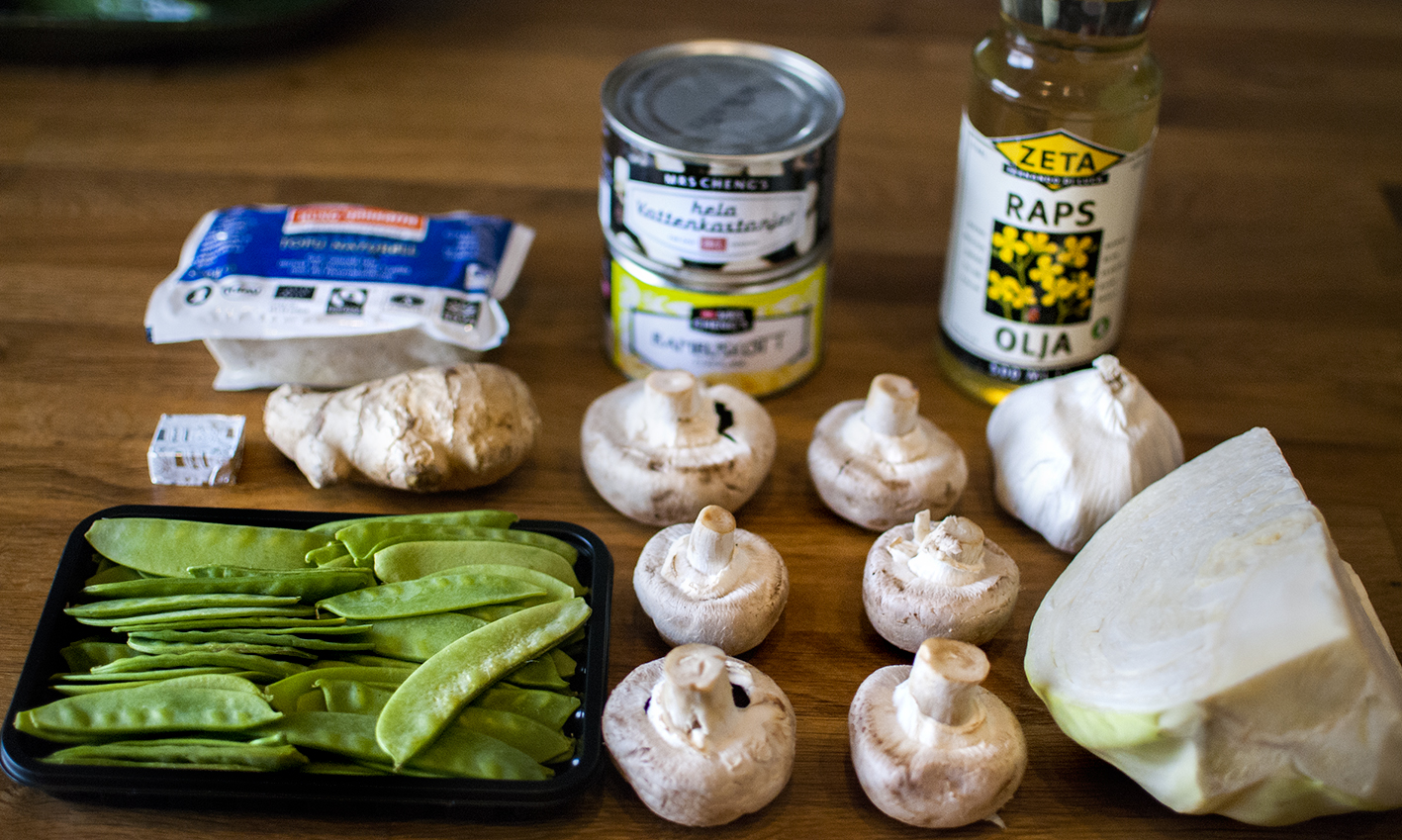 Börja med att woka svampen på hög värme. Tillsätt kål, tofu och morot. Häll i och låt ingefära och vitlök fräsa med. Tillsätt vattenkastanjer, bambuskott och sockerärter. Woka ytterligare några minuter men inte för länge, grönsakerna ska vara krispiga.