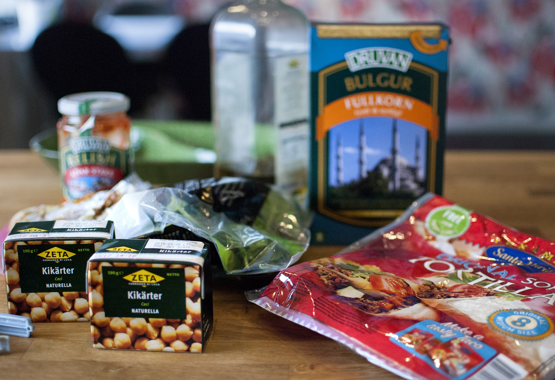 Fyll tortillabröden med bulgurröra och linda eventuellt in i folie. Servera ajvar relish-blandningen till.