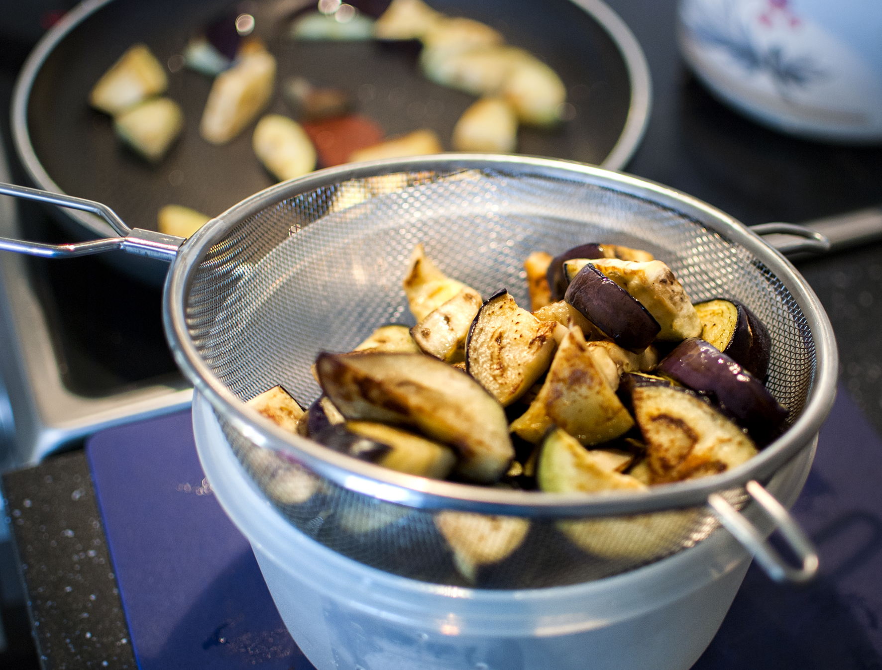 Stek champinjonerna i olja och smör. Stek auberginen i omgångar tills den får en gyllenbrun färg. Lägg allt det stekta efterhand i en sil med en bunke under så att överflödigt fett kan rinna bort.