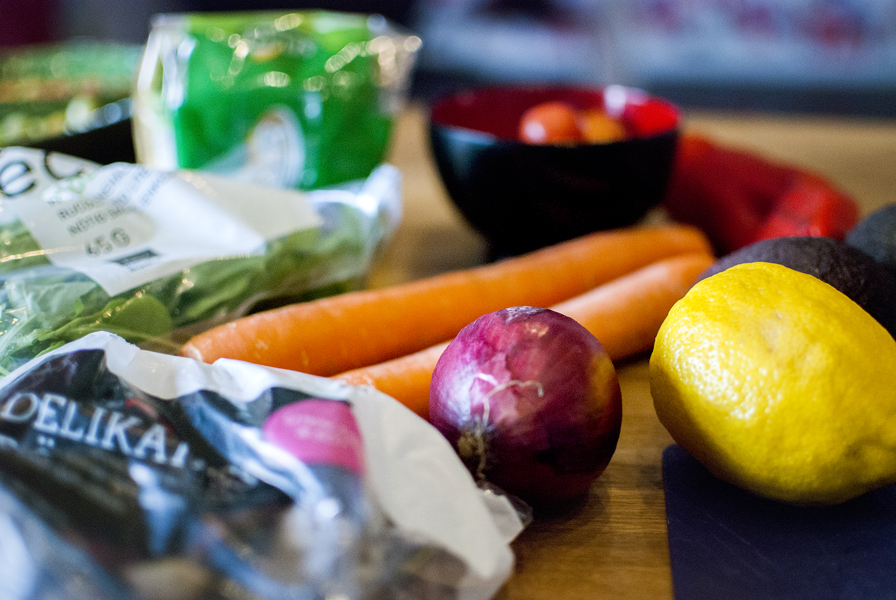 Blanda alla ingredienser i en stor salladsskål. Spraya/ringla över olivolja. Riv i skalet från en citron och pressa sedan i juicen. Salta och peppra. Smaka av! Det behövs ofta mer salt och peppar än man tror.