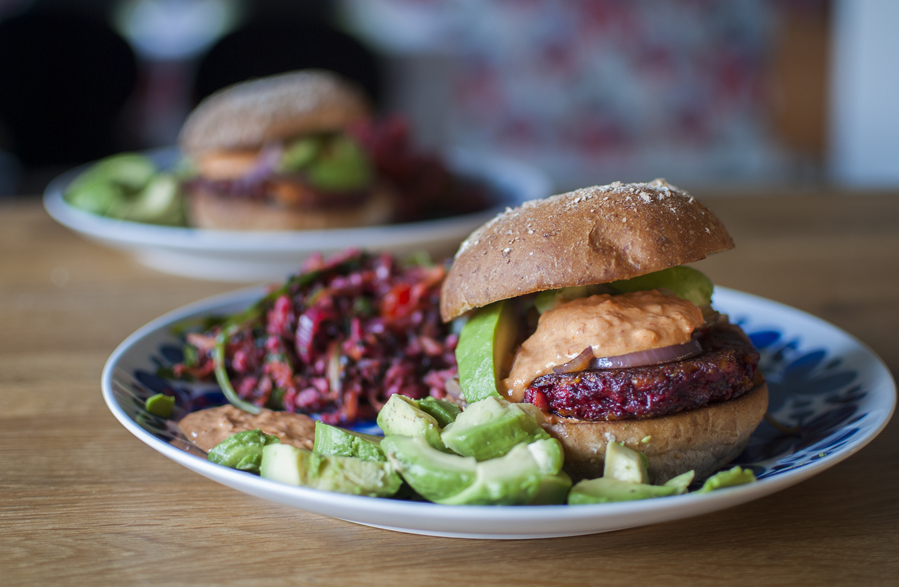 Bred ett lätt lager dressing på underdelen av ett hamburgerbröd, tillsätt rödbets- och halloumiburgaren, rödlök, mer dressing, några skivor avokado och slutligen toppdelen av brödet. Voila! En färggrann smaksensation är född.