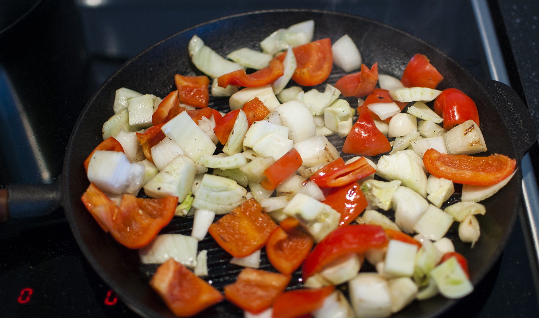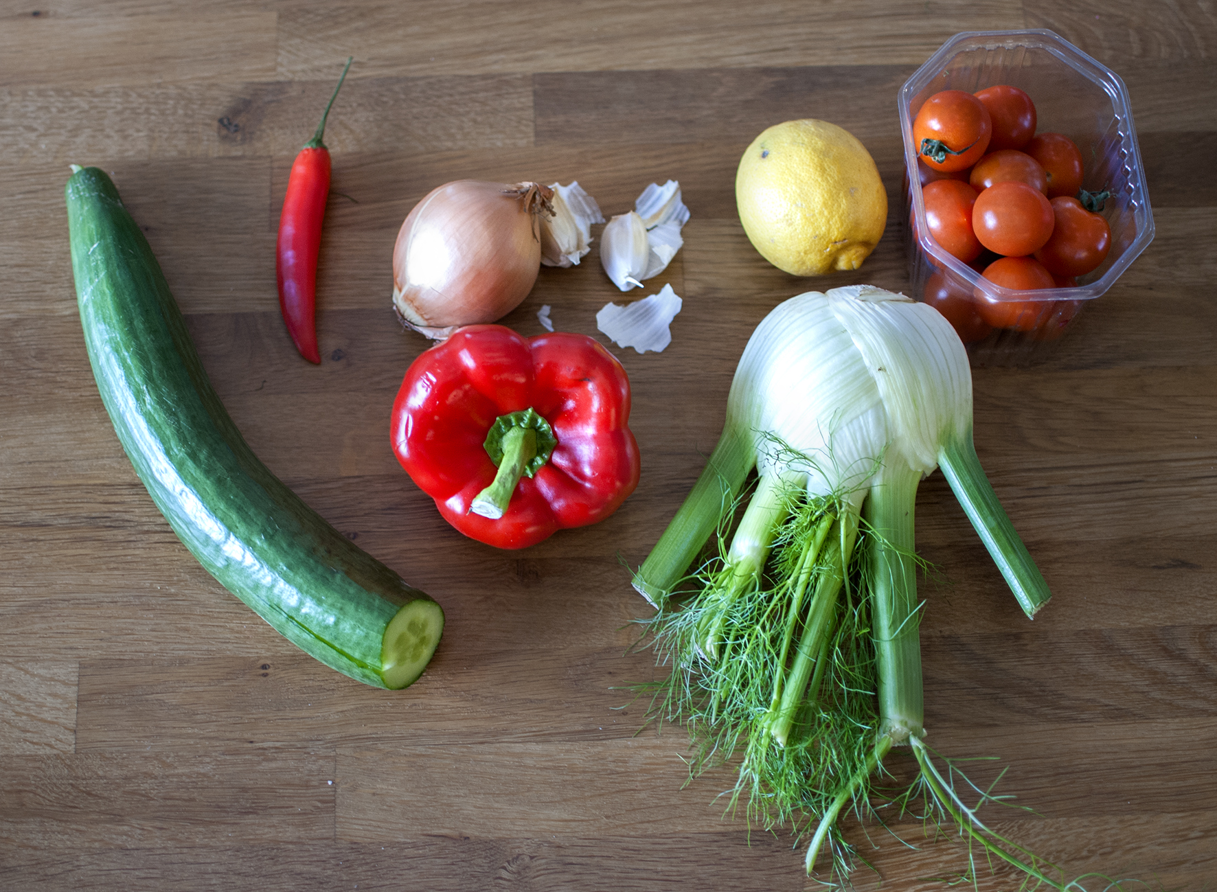 Skala lök och vitlök. Dela, kärna ur och skär paprikan i ca 2 cm stora tärningar. Skär gurka, fänkål och lök i lika stora bitar. Dela chilin och halvera tomaterna.