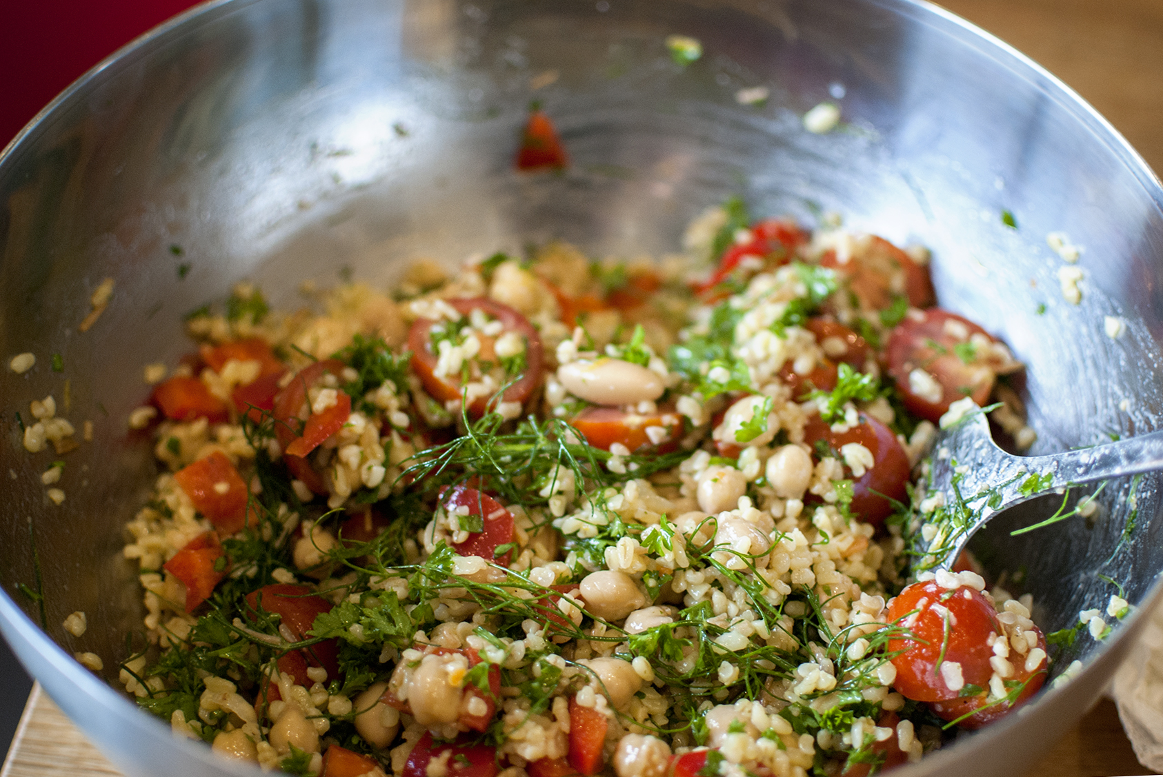 Hacka persiljan och skär dillen fint. Skär tomaterna i fjärdedelar. Dela, kärna ur och skär paprikan i små tärningar. Blanda ihop citronskal, citronjuice, socker, olja och salt i en skål. Vänd ner persilja, dill, tomater och paprika. Blanda i sköljda och avrunna bönor och kikärter. Blanda i bulgurn. Smaka av med salt, peppar och eventuellt mer citronsaft.