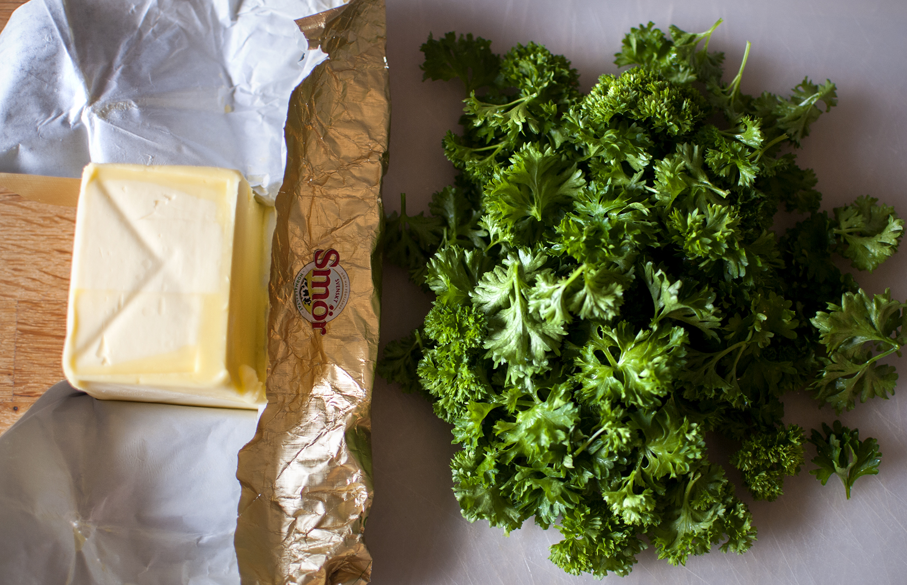 Låt smöret stå framme en stund så att det blir lättarbetat. Skölj persiljan grundligt. Ta bort stjälkar och finhacka bladen.