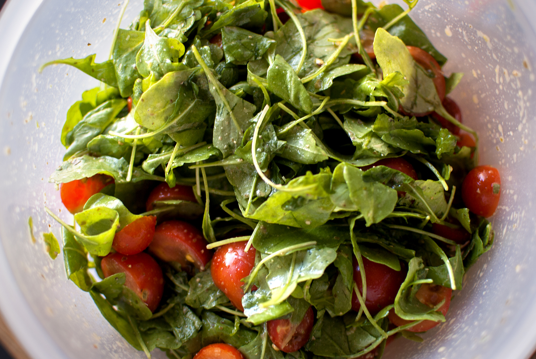 Till salladen: 65 gram (en påse) ruccola, cirka 200 gram körsbärstomater, 1 matsked pesto, salt och peppar.