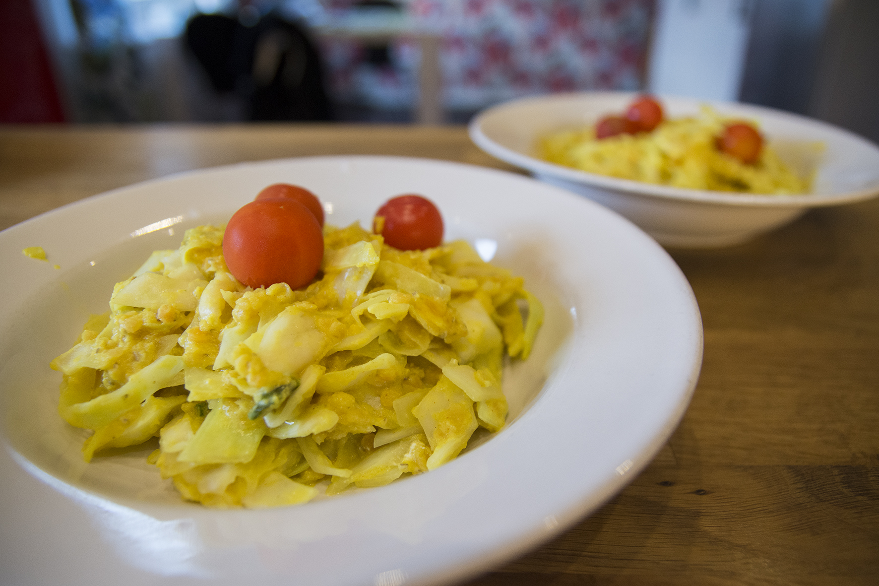 Hetta upp olja i en stekpanna. Tillsätt senapsfrön och spiskummin. Fräs en kort stund. Lägg i chilifrukter och linser. Fräs under omrörning. Tillsätt gurkmeja, kål och eventuellt lite vatten. Lägg på lock. Stek tills kålen är mjuk. Rör ner matyoghurten och smaka av med salt.