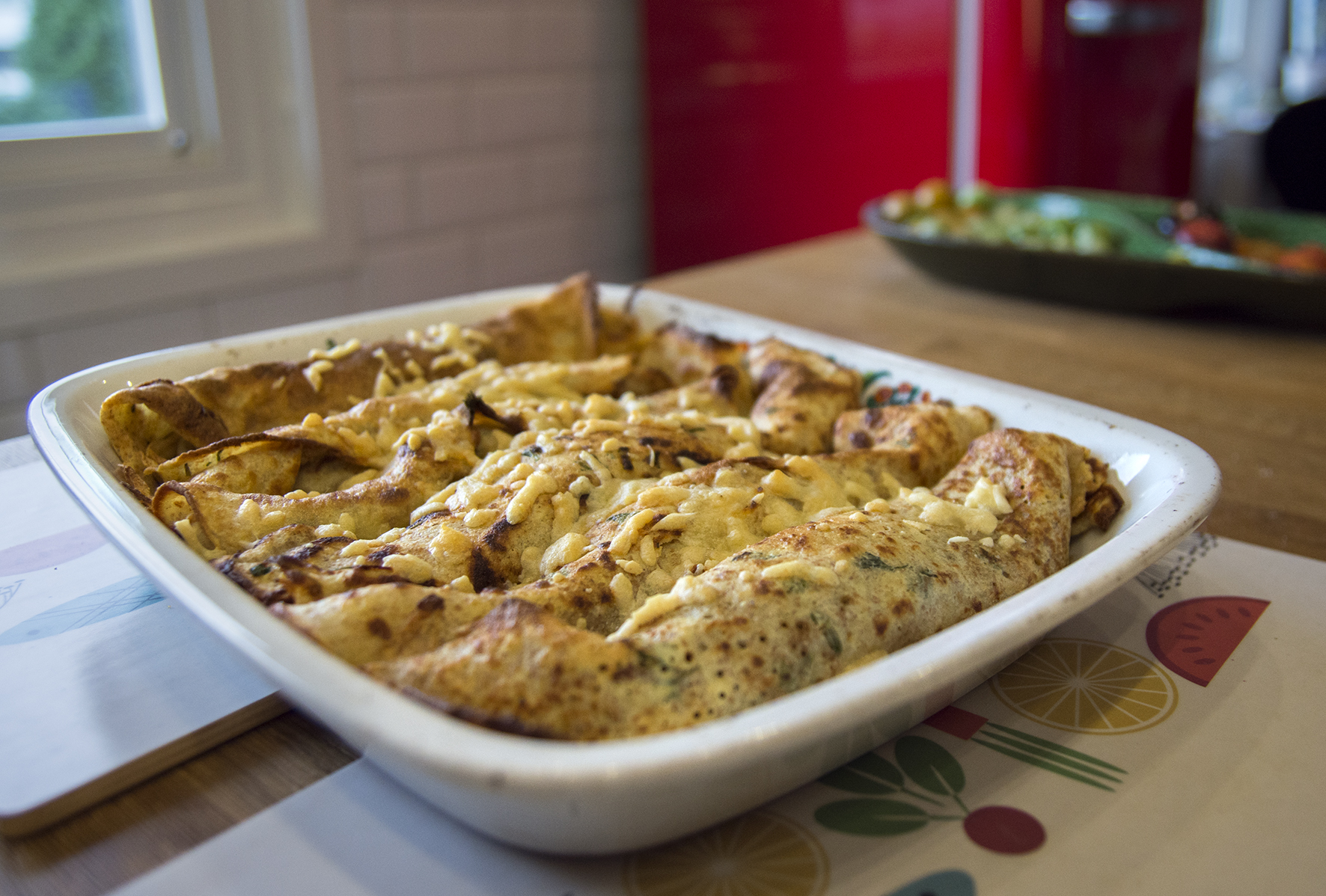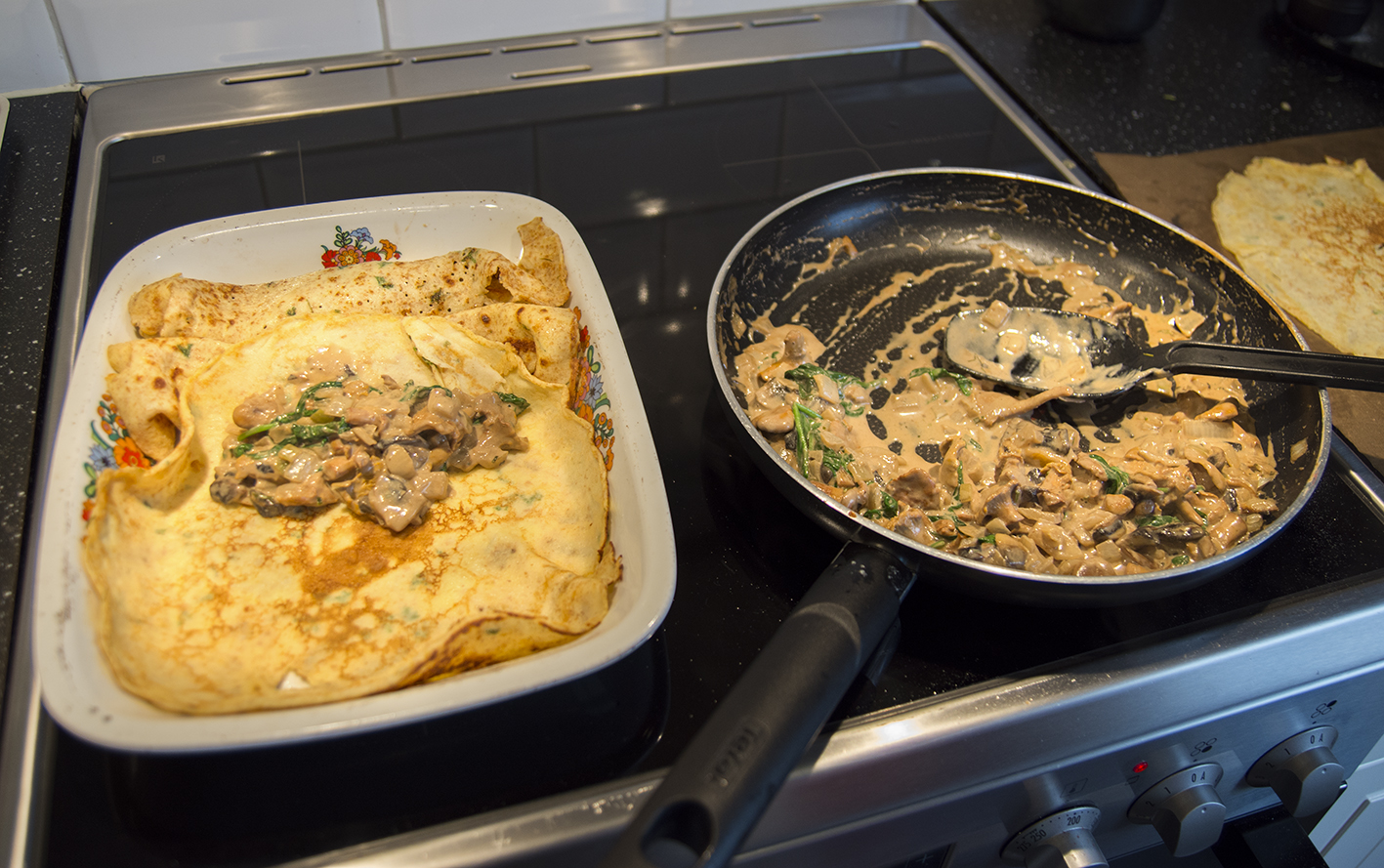 Det blev en höstig variant med svampfyllning. Tack vare goda grannar hade jag kantareller i frysen och sedan fyllde jag på med några champinjoner som snart skulle ha sett sina bästa dagar. Örter och grahamsmjöl i smeten gör att det blir mindre pannkaka över det hela. Lyxigt, matigt och väldigt gott. På köpet får du ett kök med doft av ursvensk skog.