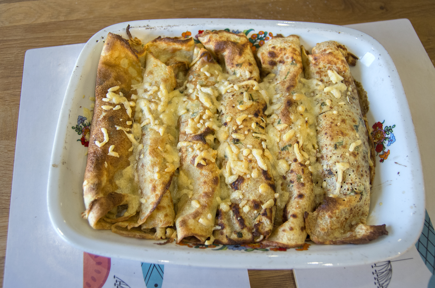 Börja med crepesen. Vispa ihop ägg, mjöl, mjölk, örter smör och salt till en slät smet. Är den för tunn: ta i lite mer mjöl, är den för tjock, späd med mjölk. Häll i lagom med smet i en het panna och grädda. Vänd. Gråt inte om den första blir helt misslyckad, det hör till.