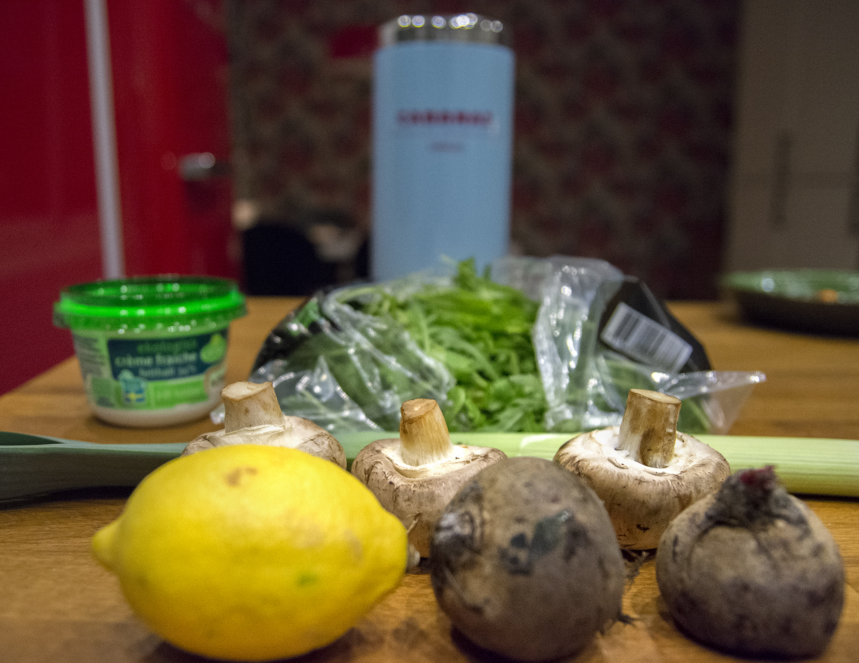 Häll av pastavattnet och låt rinna av i ett durkslag. Häll över svamp, rödbetor och purjo i pastagrytan. Tillsätt creme fraiche och låt koka upp. Riv i skalet från citronen. Häll pastan i grytan och tillsätt hälften av ruccolan. Rör om. Smaka av med lite citronsaft och kryddor.