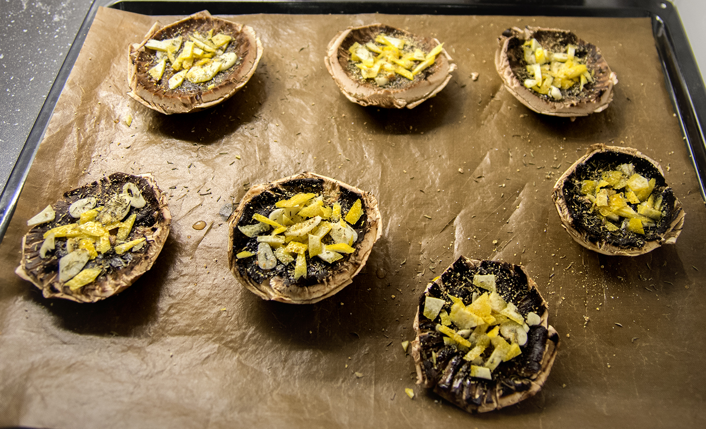 Skala och skiva vitlöken. Skala citronen med en potatisskalare och skär skalet i grova strimlor. Lägg vitlök, citronskal och timjan på svampen. Krydda och ringla över olja och vatten. Lägg svamparna på ugnsplåtar. (Kan förberedas hit.)