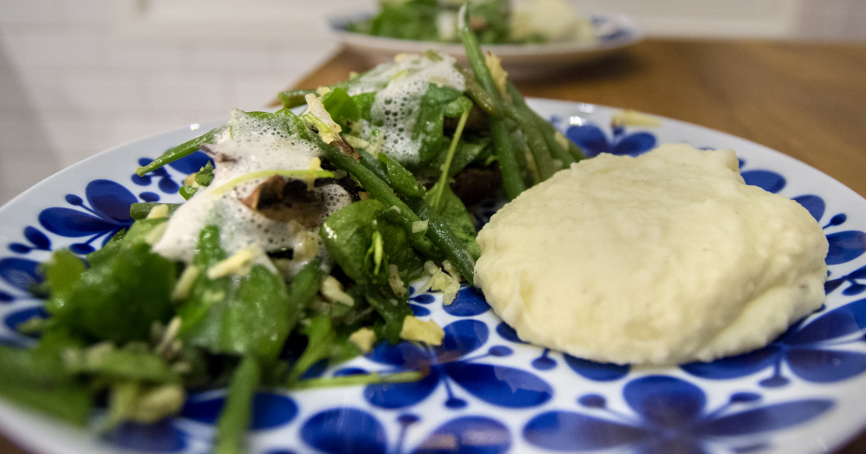 Ta bort vitlök, timjan och citronskal från svampen. Varva spenatsallad och portabello på tallrikar. Häll ingefärsskum över och servera med potatispurén. Servera gärna med ett gott bubbel i glasen. Det blir ett garanterat Gott Nytt År!