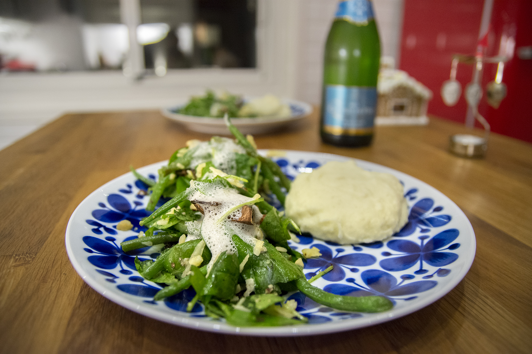 Börja med salladen. Rosta hasselnötterna i en torr stekpanna och grovhacka dem. Skär haricots verts på mitten och koka dem mjuka, ca 3 minuter, häll av och låt svalna. Hyvla eller grovriv osten. Blanda haricots verts med spenat, hasselnötter, ost, olja och kryddor. Smaka av och ställ åt sidan.
