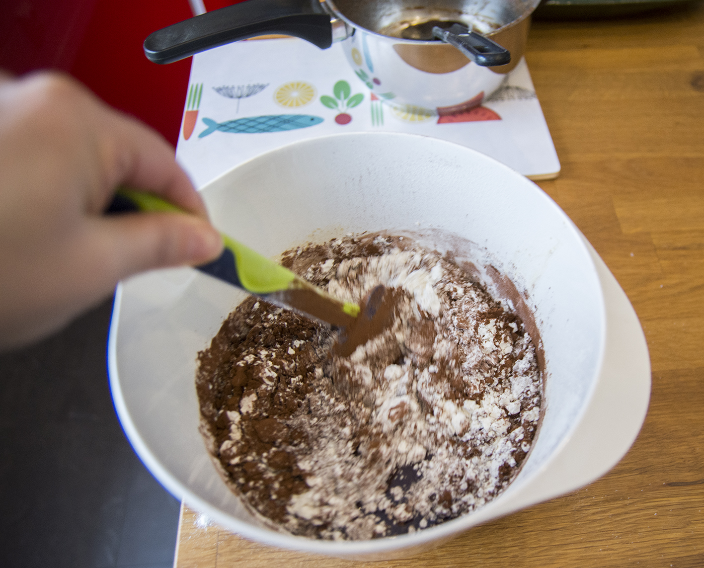 Blanda socker, farinsocker, sirap och ägg i en bunke. Sikta ner mjöl och kakao.