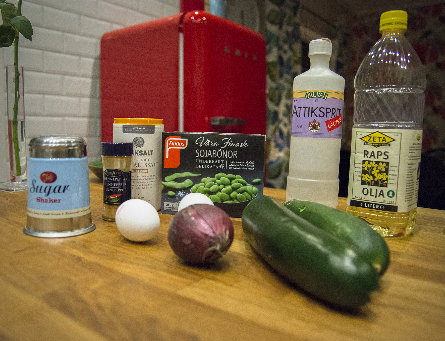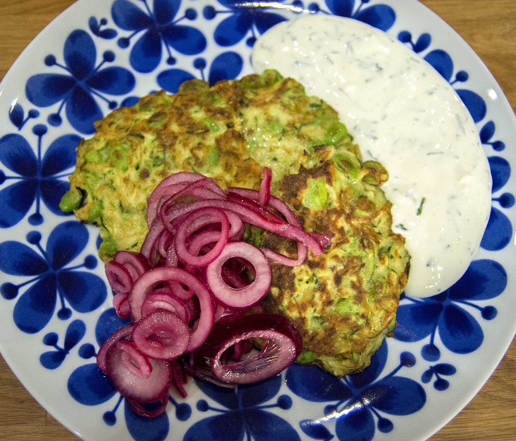 Riv zucchinin grovt och pressa ur vätskan. Blanda ägg, mjöl, mjölk, kryddor, sojabönor och zucchini i en bunke. Forma smeten till plättar som du steker i omgångar.