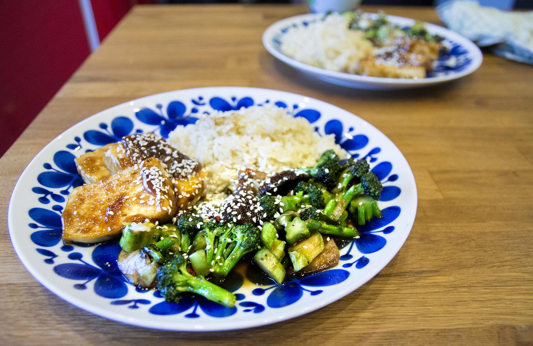 Lägg upp riset på tallrikarna bredvid grönsakerna och tofun. Toppa med sesamfrön.