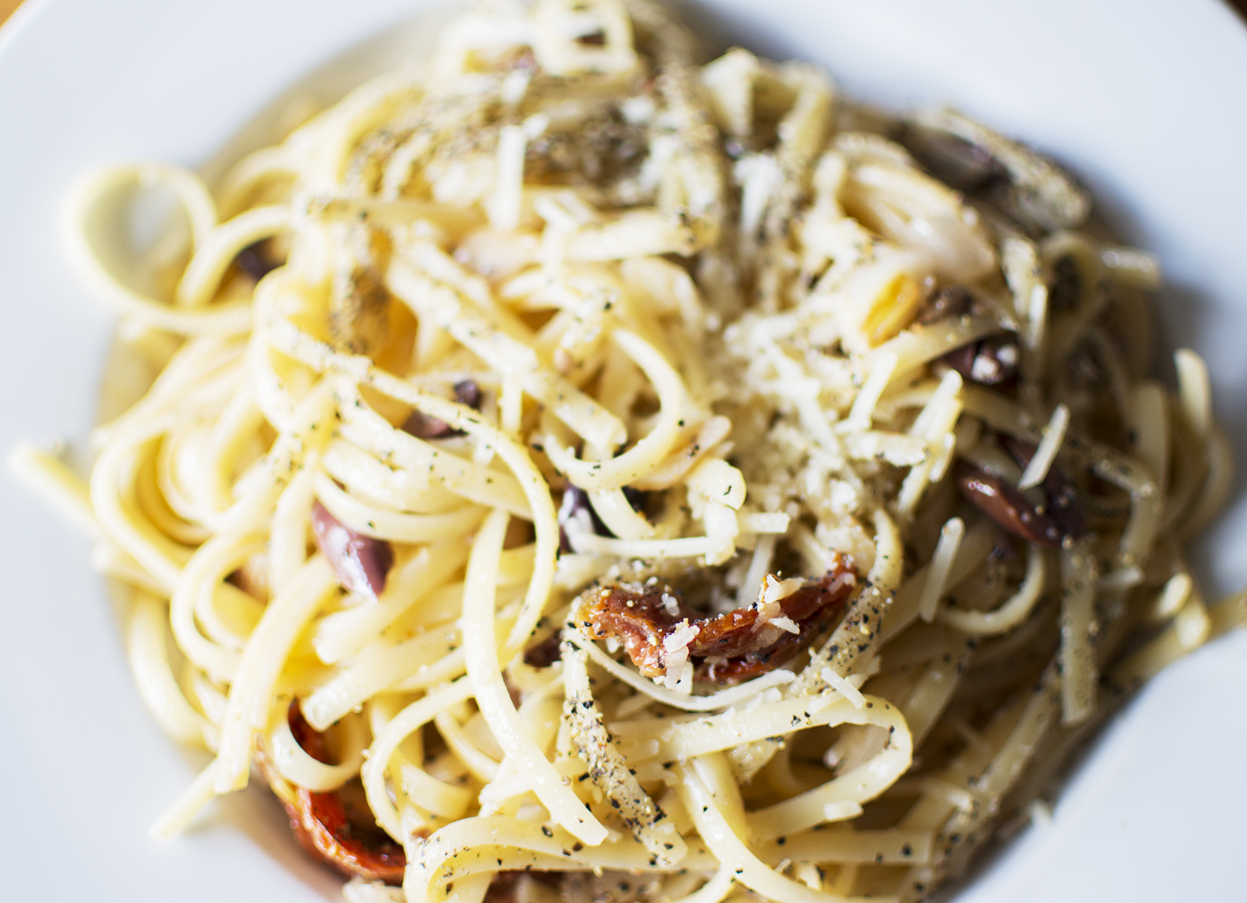 Vispa ihop ost och 2 msk av pastavattnet. Vänd ihop spaghettin med med smör och de stekta grönsakerna. Rör i ost- och vattenblandningen. Späd med ytterligare kokvatten så att carbonaran blir krämig. Smaka av med salt och svartpeppar. Riv över lite extra parmesanost.
