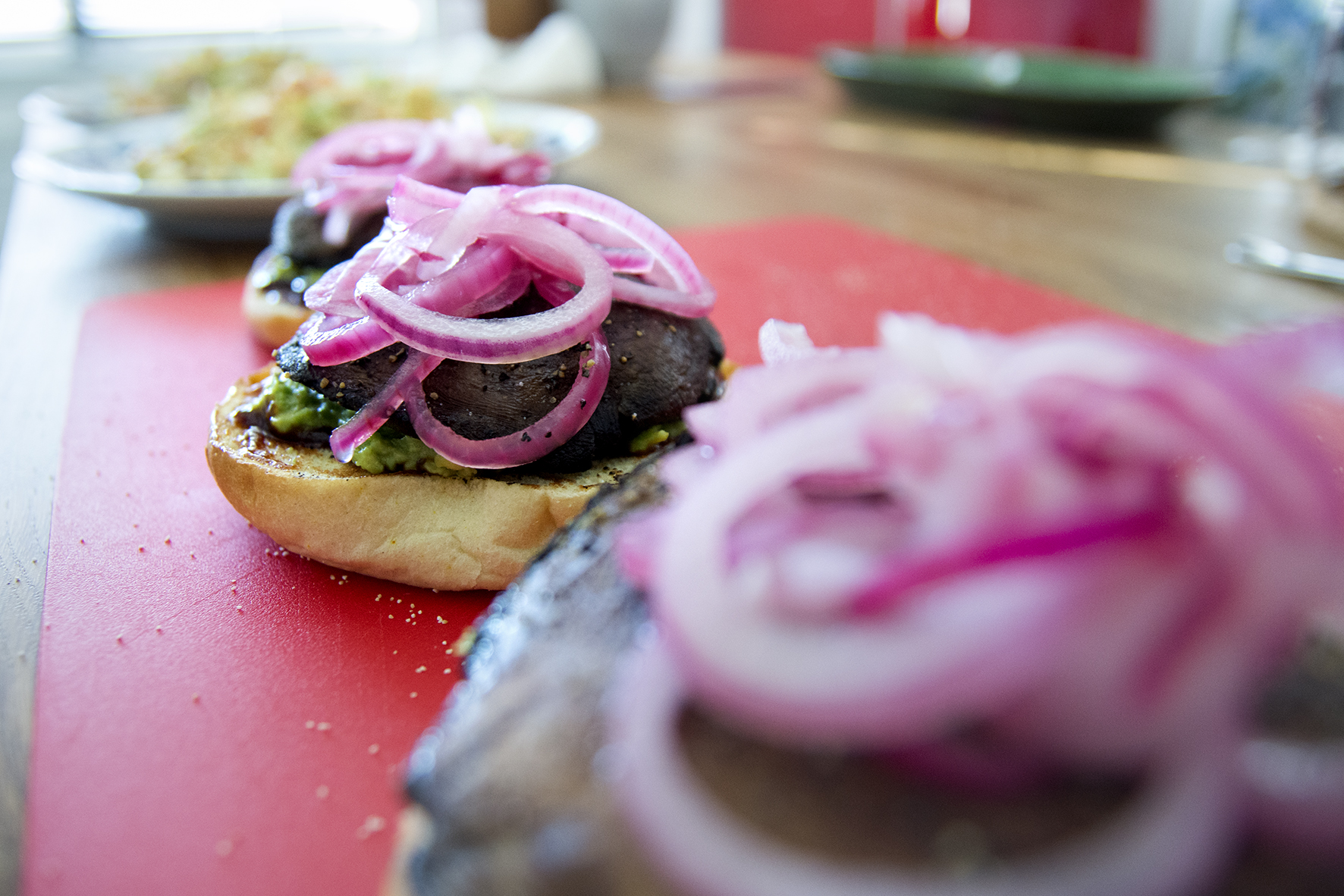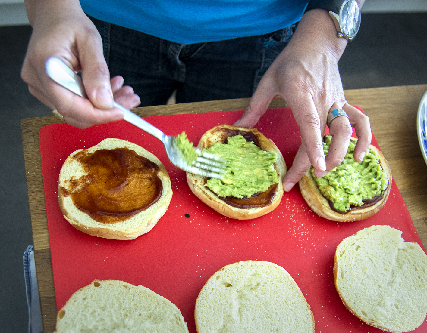 Montera burgaren: klicka på barbecuesås, därefter mosad avokado, svamp och rödlök. På med locket – klart!