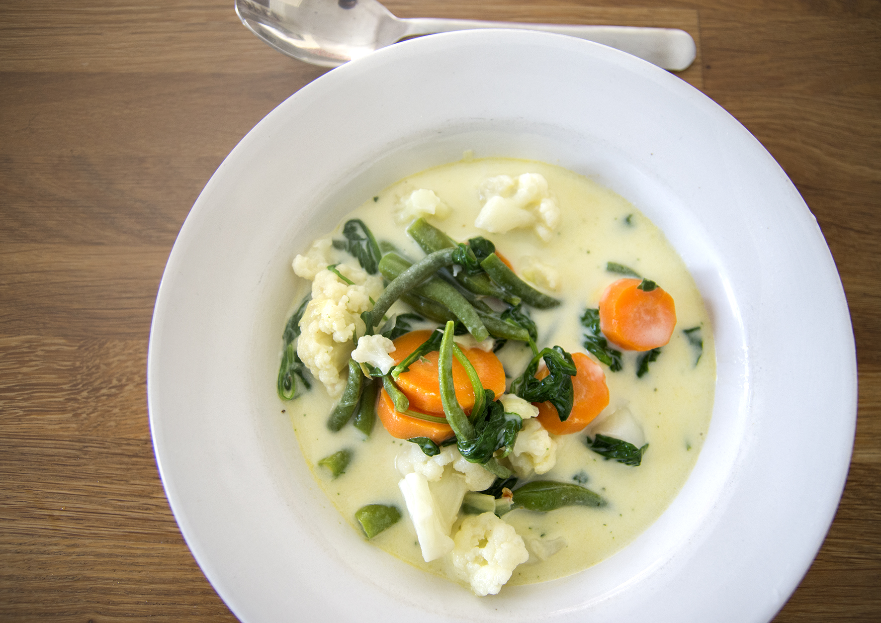 Häll i vatten och låt koka cirka 5 minuter. (Lägg i den frysta blomkålen nu.) Låt koka tills grönsakerna mjuknat något men så att det fortfarande finns tuggmotstånd kvar. Häll i bladspenaten och rör om.
