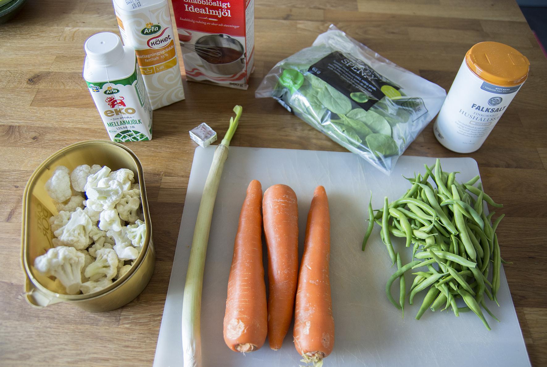 Skala morötterna, skiva och skölj purjolöken, snoppa bönorna och dela de största i mindre delar. Skiva morötter och purjo. Om du har färsk blomkål, skölj och skär den i små buketter.