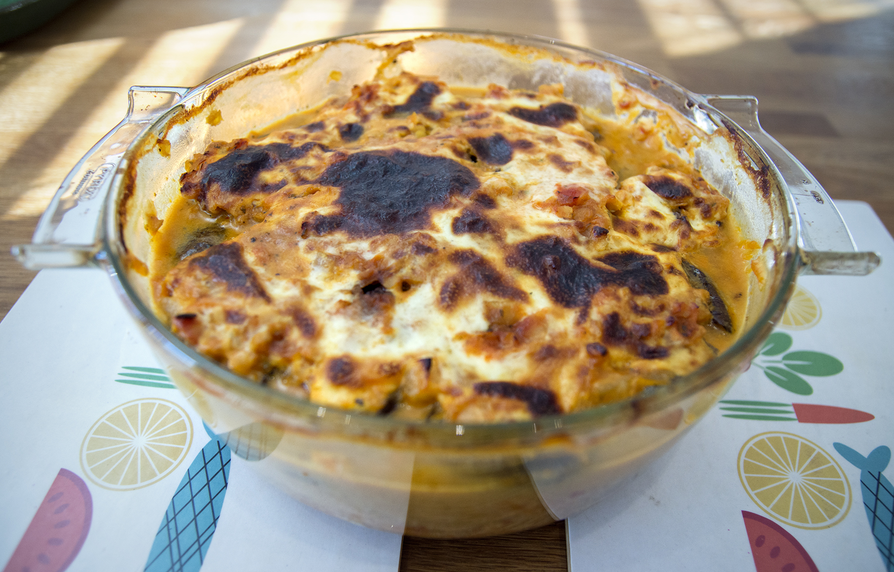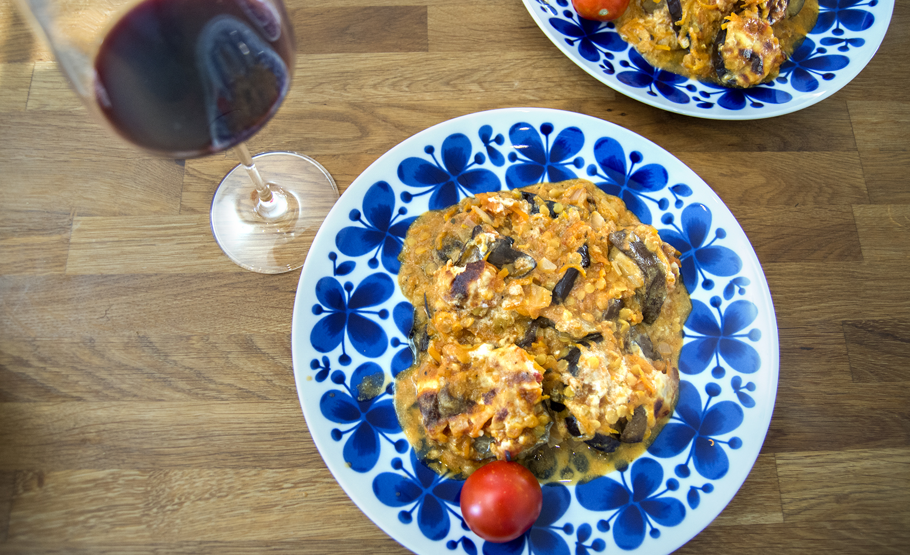Den här sommaren har jag hållit mig hemma* och mest pysslat i hem och trädgård. I stället för en fysisk resa fick det därför bli en matresa till ett av mina favoritländer: Grekland. Den här gången en vegetarisk variant på nationalrätten moussaka, som väl närmast kan beskrivas som en lasagne utan pasta. Jag tog i stora bitar portabellosvamp, vilket gav extra tuggmotstånd. Tummen upp från maken!