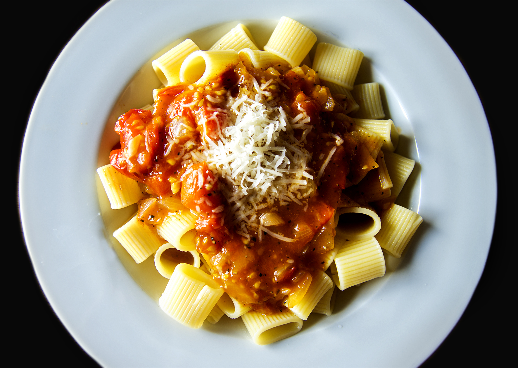 Lägg upp pastan på tallrikar, pytsa över tomatsås och toppa med lite riven parmesanost.