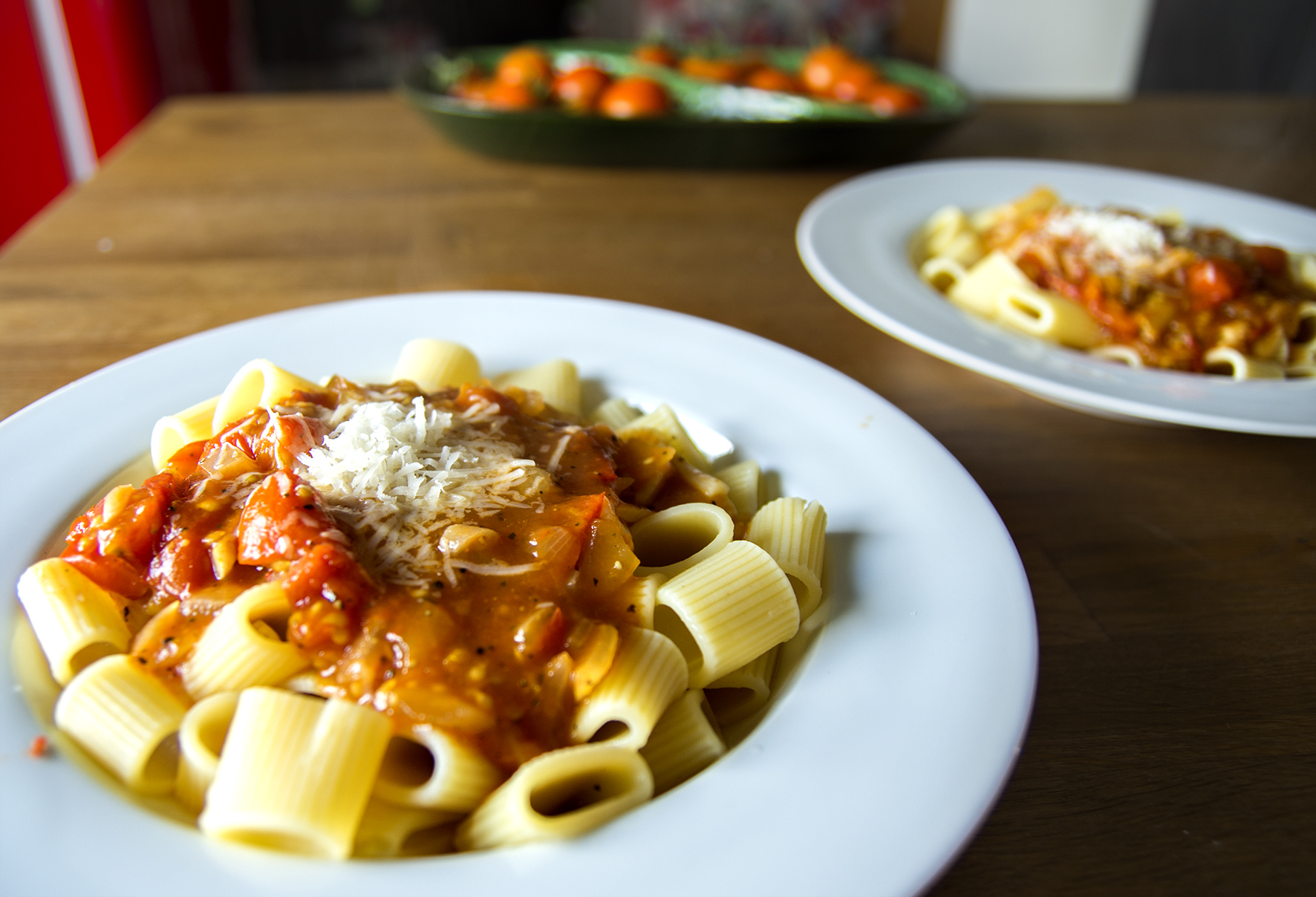 Ännu en vecka med röda grönsaker i fokus, eftersom mina tomatplantor fortfarande ger skörd. Den här pastarätten kan jag verkligen rekommendera för dagar när du har annat att göra än att stå vid spisen. Såsen blir klar under tiden som pastan kokar* – snabbmat på italienska! Självklart funkar det lika bra med köpetomater.
