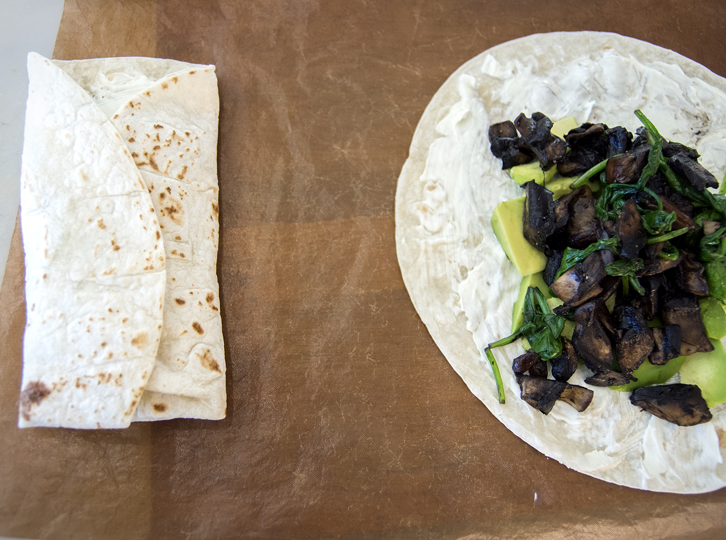 Stek svampen i smör till all vätska sugits upp. Tillsätt babyspenaten och rör om. Smaka av med salt och peppar. Fördela blandningen på tortillabröden och vik ihop till behändiga wraps. För extra hållfasthet: svep en bit aluminiumfolie runt botten.