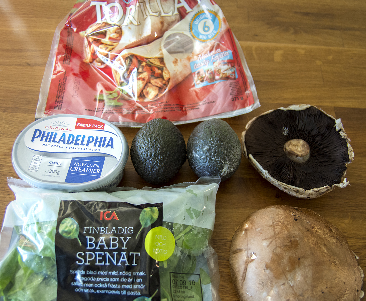 Ansa svampen och skär den i mindre bitar. Skala och skär avokadon i strimlor. Bred färskost på tortillabröden och lägg på avokadostrimlorna