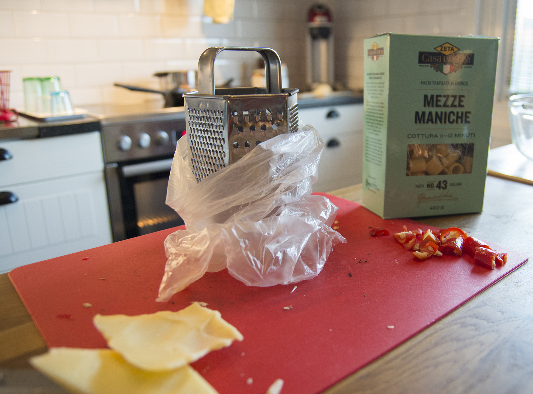 Häll av kokvattnet från pastan och blanda med de stekta grönsakerna och krossade tomater. Blanda ner hälften av den rivna osten och rör om. Strössla över resten av osten.