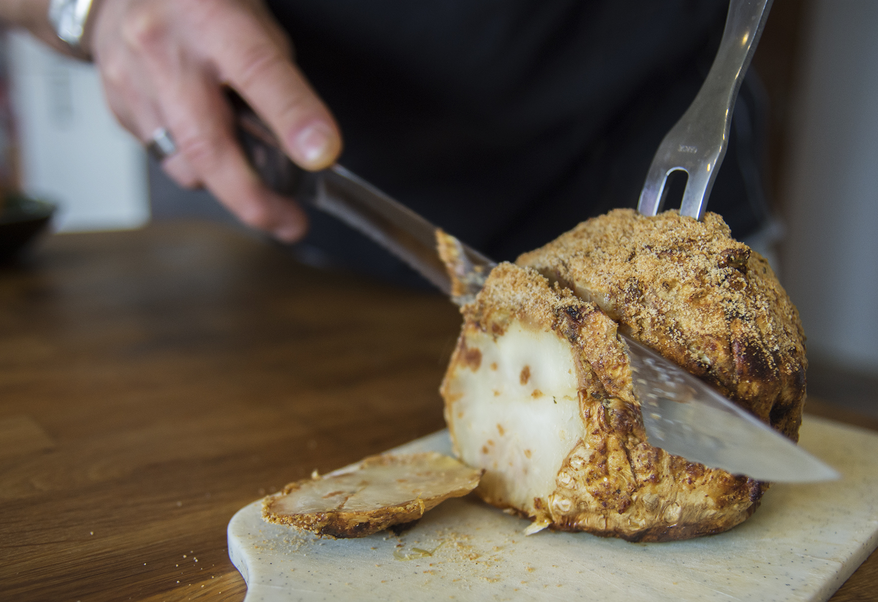 Dags för del två i vegetarianens kamp för ett mättande och gott julbord. Passar precis lika bra för köttätare som vill smaka på något gott mellan tuggorna. Den här ”skinkan” innehåller garanterat inte ett enda spår av just skinka. Ej heller något som lämnat ett djur, ty den är vegansk. Har du googlat på vegetarisk skinka så har du säkert fått träffar på griljerad kålrot. Detta recept använder i stället rotselleri, något som jag tror är betydligt godare (har inte testa kålroten dock). Sellerin får en härlig sötma när den bakas i ungen och den smaken bryter fint av mot syrligheten i vinet som man öser den med.