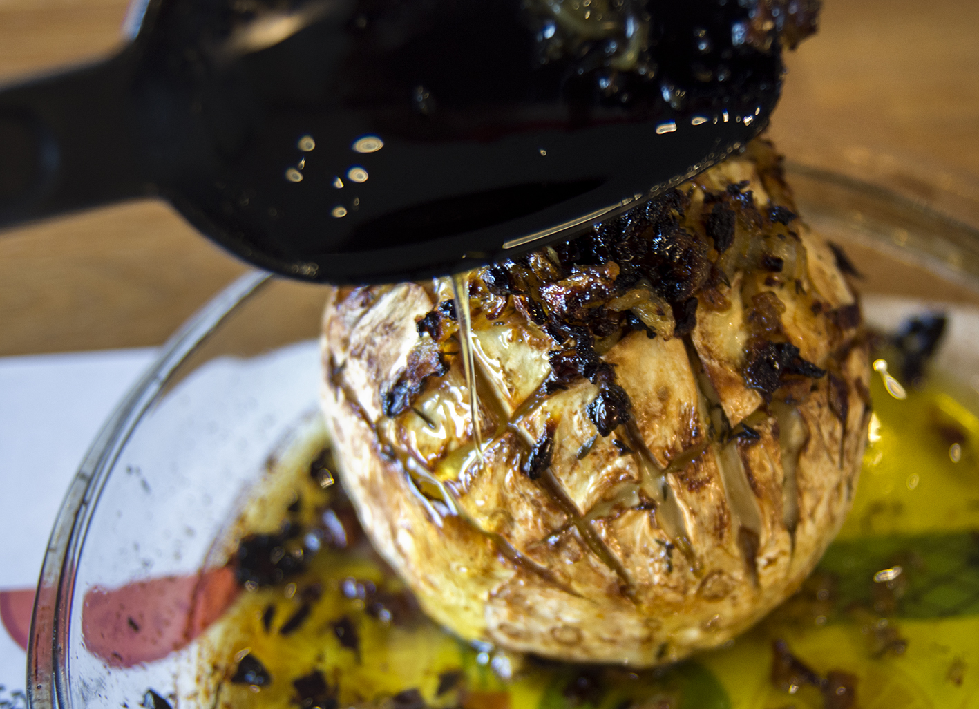 Häll lökoljan över rotsellerin när det gått 45 minuter och fortsätt att baka rotsellerin ytterligare ca 45 minuter.