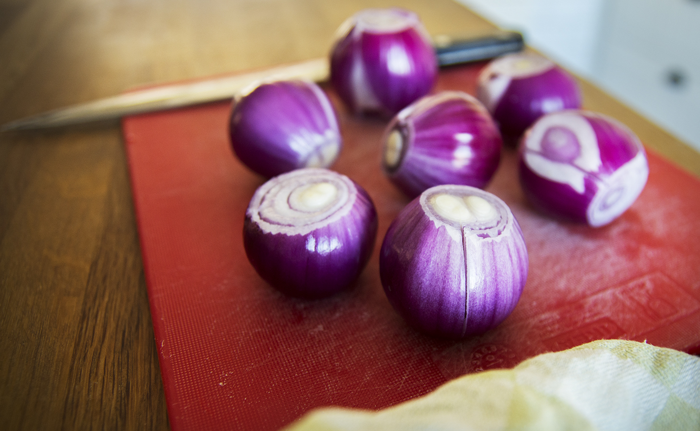 Skala löken, skär i tunna skivor och fräs i oljan tills den mjuknat. Låt löken svalna.