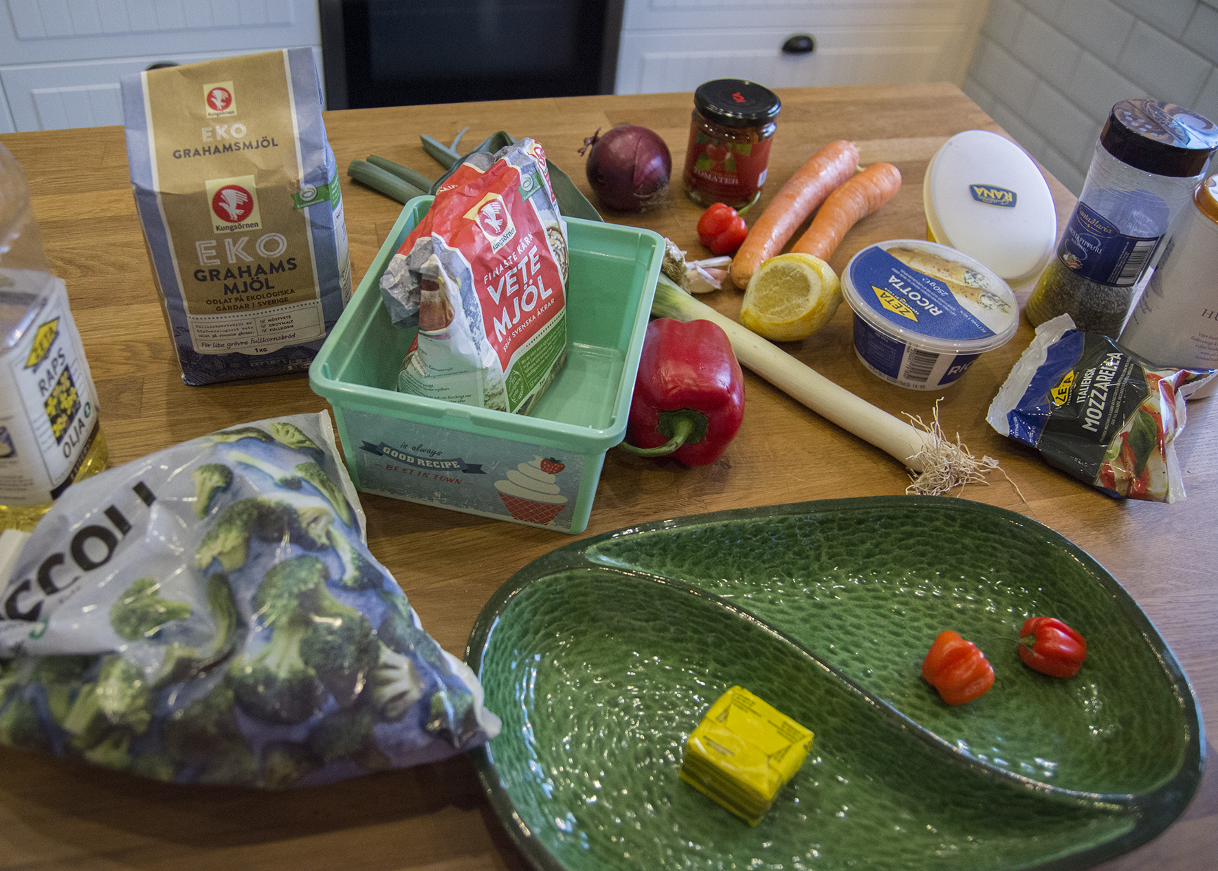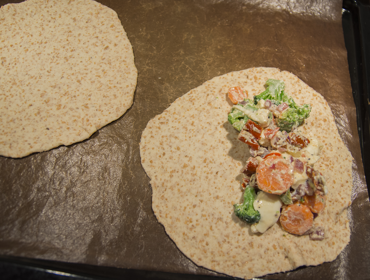 Fixa fyllningen under tiden. Hacka rödlök, vitlök, skölj och strimla purjon, skala och hacka moroten i fina slantar. Tina broccolin om den är fryst annars putsa den färska och skär ut små fina buketter. Grovhacka mozzarellan. Stek grönsakerna tills de mjuknat och fått fin färg. Tillsätt mozzarella och ricotta och rör ihop allt till en slags smet. Salta och peppra, smaka av.