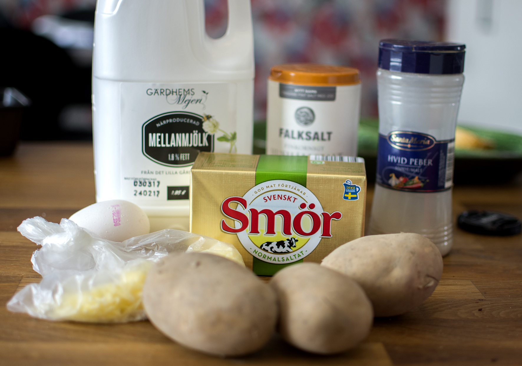 Separera äggulan från vitan. Häll av vattnet från potatisen och tillsätt smöret och lite av mjölken. Obs! Moset ska vara betydligt fastare än om det serveras au naturel, var därför försiktig med mjölken och pytsa hellre i lite i taget, det går inte att rätta till (om du inte orkar koka mer potatis, vill säga). Stöt potatis, mjölk och smör till ett mos. Tillsätt osten och äggulan. Salta, peppra och smaka av. Stöt ytterligare tills konsistensen är slät.
