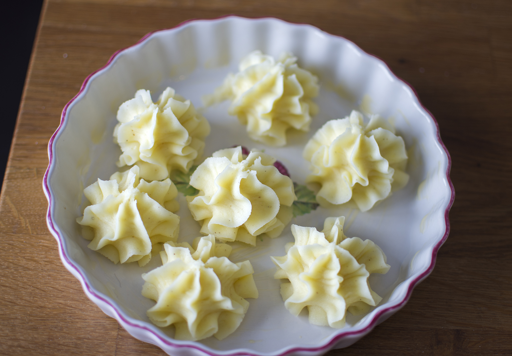 Låt dig inte luras av rättens fancy namn, det är i grunden spritsat potatismos med lite bling i form av ost och äggula. Något att imponera på gäster med för det är inte så svårt, men gott och väldigt fint.