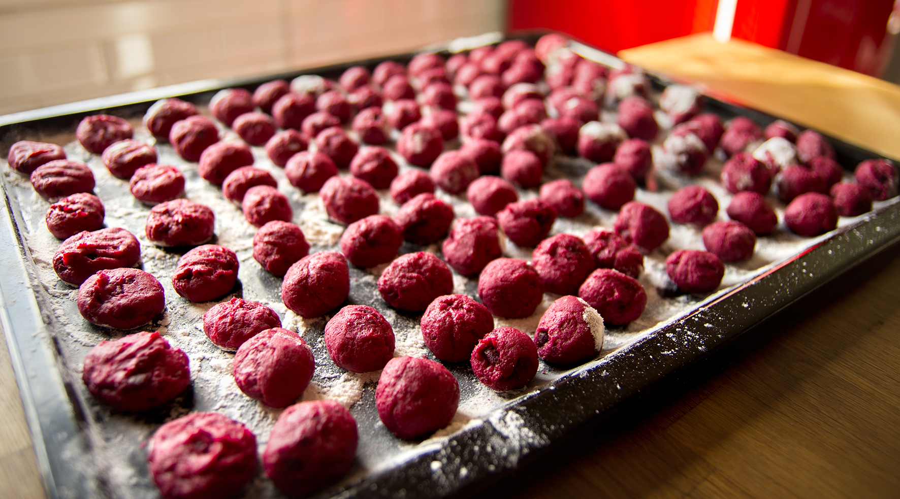 Häll rotsakerna i en stor bunke och stöt med potatispress. Blanda ner äggulor och salt och rör till sist ner mjöl tills smeten blivit till en fast deg. Dela degen i mindre delar och rulla till cirka 2 centimeter tjocka korvar. Skär i bitar som är ungefär lika stora som en stor vindruva. Rulla bitarna och lägg på en mjölad plåt. Låt torka i ungefär en halvtimme.