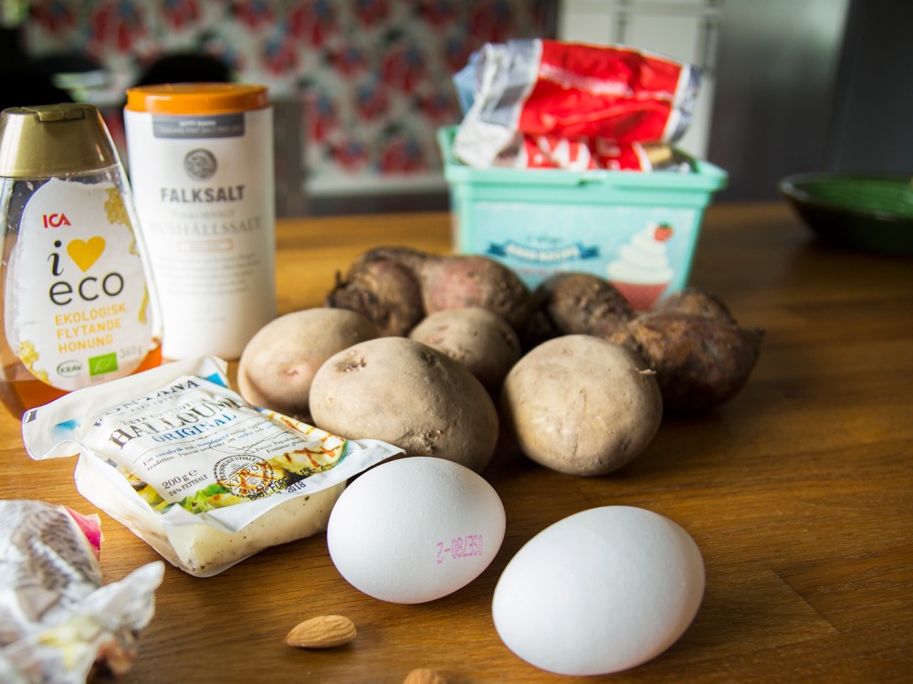 Jag gjorde en del avsteg från Johanna Westmans originalrecept. Mest praktiska som att det inte alls är nödvändigt med separata kastruller för att koka rödbetor och potatis när de ändå ska förenas i en härlig röd röra efteråt men också att jag bytte getost mot just favoriten halloumi. Men jag borde ha gjort som hon när det gäller de karamelliserade nötterna. Mitt försök slipper du här. Rätten går lika bra utan.