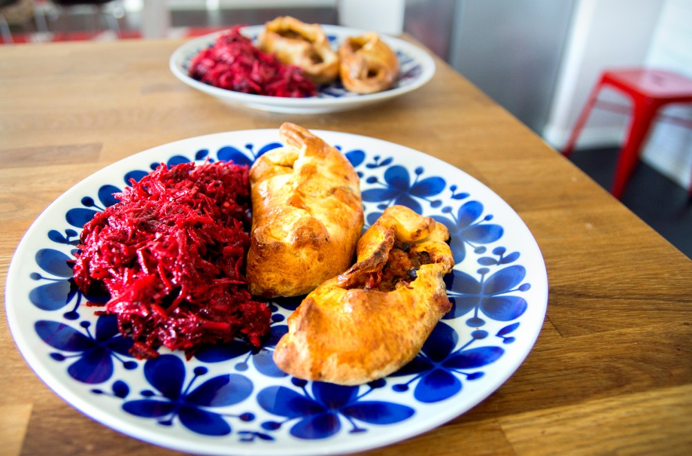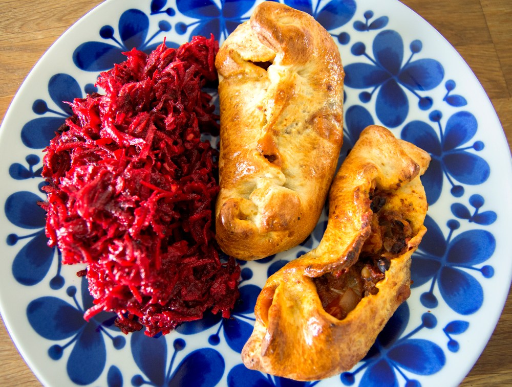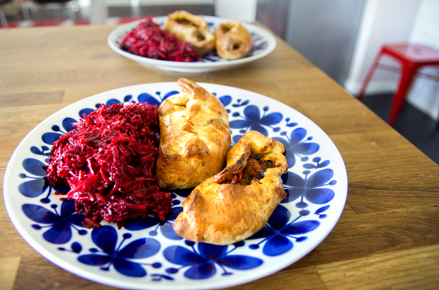 Jag såg det framför mig, en knivskarp bild av små perfekta knyten med ett smakrikt inre som ångade upp när kniven skar genom det frasiga höljet. Och ja! Innanmätet var hur gott som helst, och visst ångade det om pirogerna. Men nä! Särskilt snygga blev de inte för hur jag än klämde så vägrade degen klibba ihop och de såg snarare ut som någon slags komage som fläkt ut sig helt ogenerat. Men som sagt: goda. Mättande. Och eftersom jag var mer än lovligt lat och använde en färdig pizzadeg så var de också väldigt lättlagade. Klart värda att göra. Blunda om du måste.