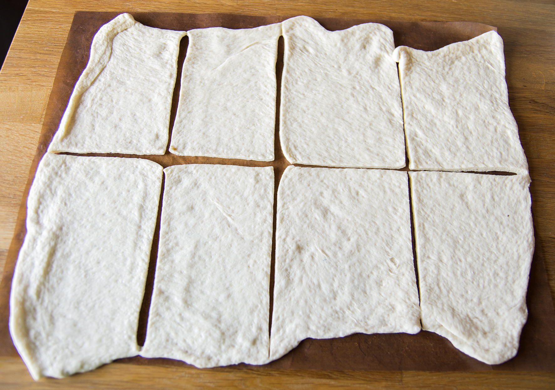 Rulla ut pizzadegen på ett bakplåtspapper och kavla ut den något. Dela den i 8 lika stora fyrkanter. Fördela fyllningen på degen och vik ihop till paket (så gott det går!).
