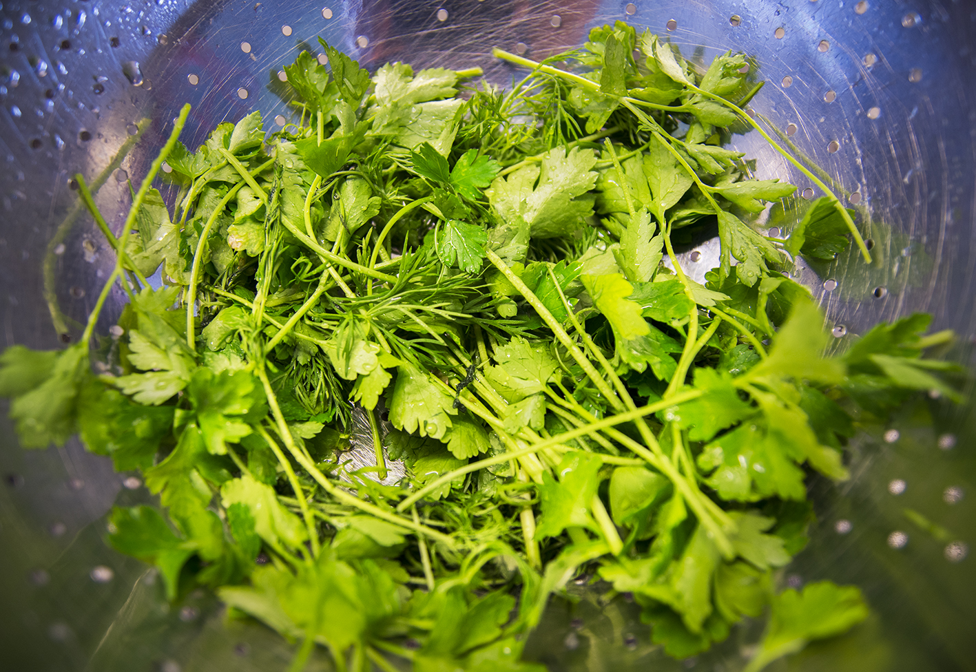 Skölj de färska örterna, repa av persiljbladen från stjälken och hacka dem i lite mindre delar, finhacka gräslöken, rensa bort de grövsta stjälkarna från dillen. Blanda örterna med gräddfilsblandningen. Smaka av med salt och peppar.