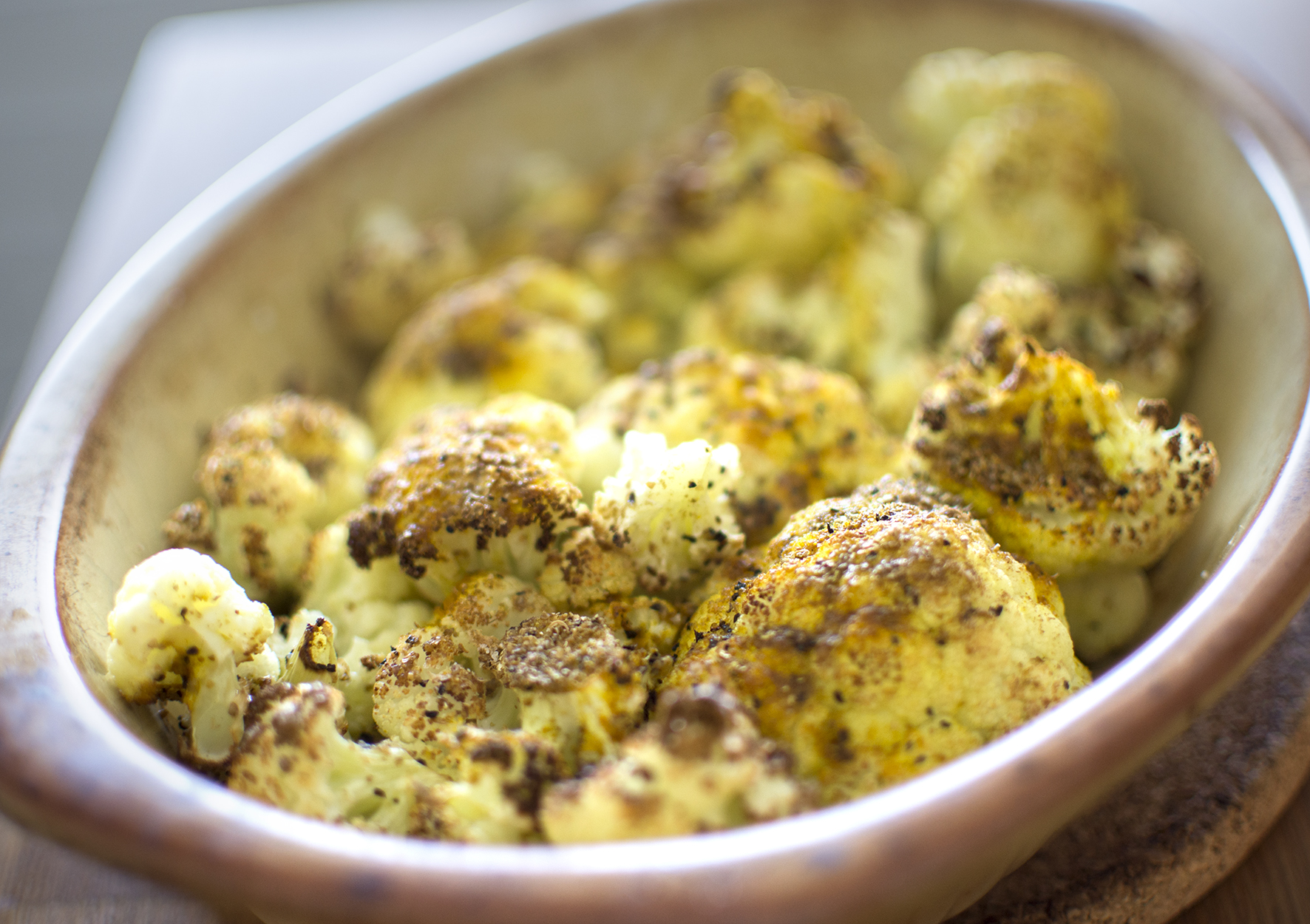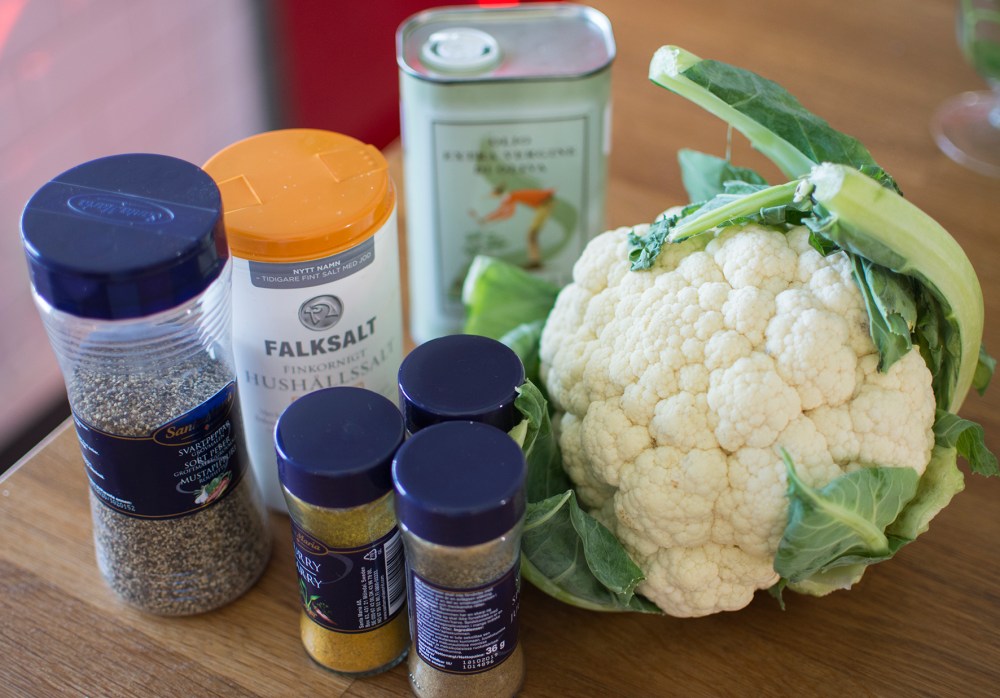 Rosta blomkålen i ungefär 20 minuter, till den fått fin färg och har mjuknat något men fortfarande har tuggmotstånd.